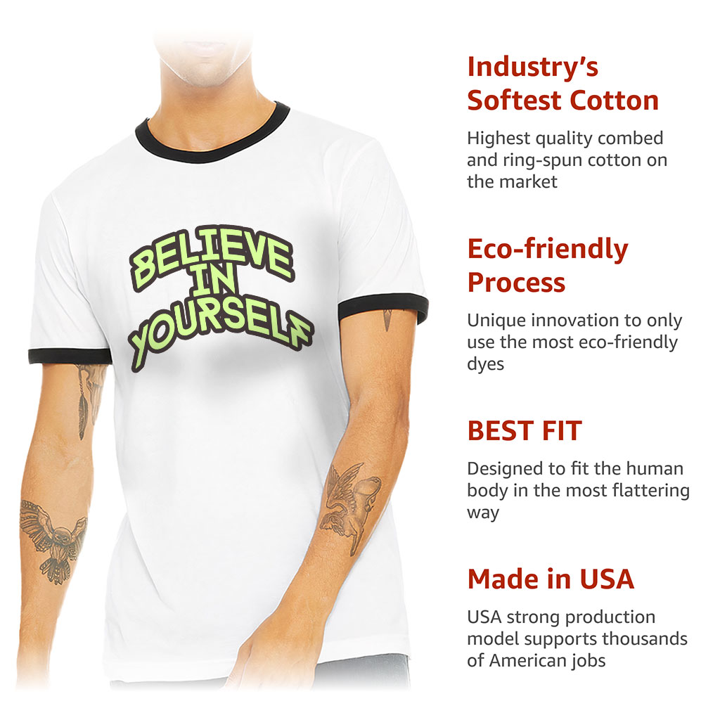 This trendy T-Shirt for men is made of a lightweight and soft cotton-poly blend, breathable and comfortable to wear. Believe in Yourself Ringer T-Shirt will give you an excellent wearing experience all day.